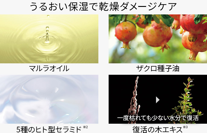 保湿力、抗酸化力※1の高い「マルラオイル」や「ザクロ種子油」をはじめ「5種のヒト型セラミド※2」など保湿成分がたっぷり。